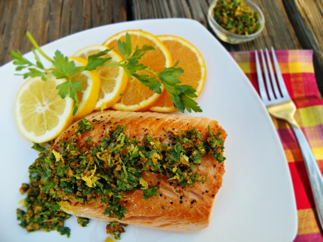 PAN ROASTED CITRUS SALMON WITH SPICY PECAN GREMOLATA