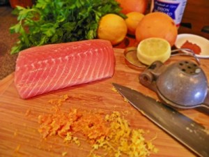The following recipe is a lightened up and simplified version of a winning recipe originally submitted to Country Woman magazine as Pan-Fried Catfish with Spicy Pecan Gremolata (October/November 2011, p. 34). I’m using salmon here and pan roasting it instead of frying to lighten it up. The citrus flavors in are amplified with the addition of the fresh juices in the citrus “bath”.