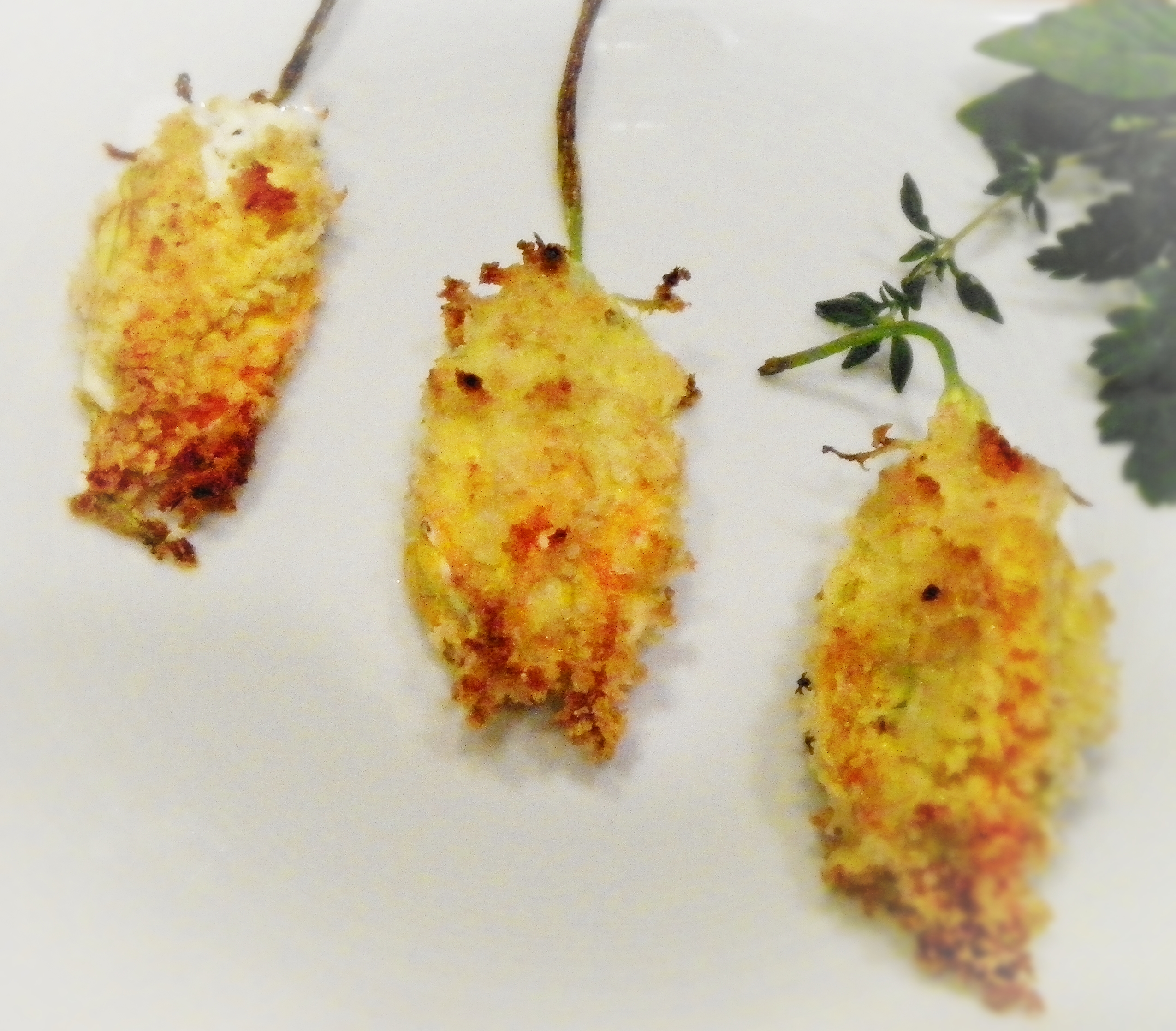 I didn’t want to fry them. So I decided to bake them. I just stuffed them with a little herb and lemon zest-infused goat cheese. Then I dipped them in a little egg wash and rolled them around in a little panko. I sprinkled a little granulated garlic on each one and at the last minute, I decided to drizzle the tiniest amount of melted butter over each one. I thought the butter would help the panko brown nicely.