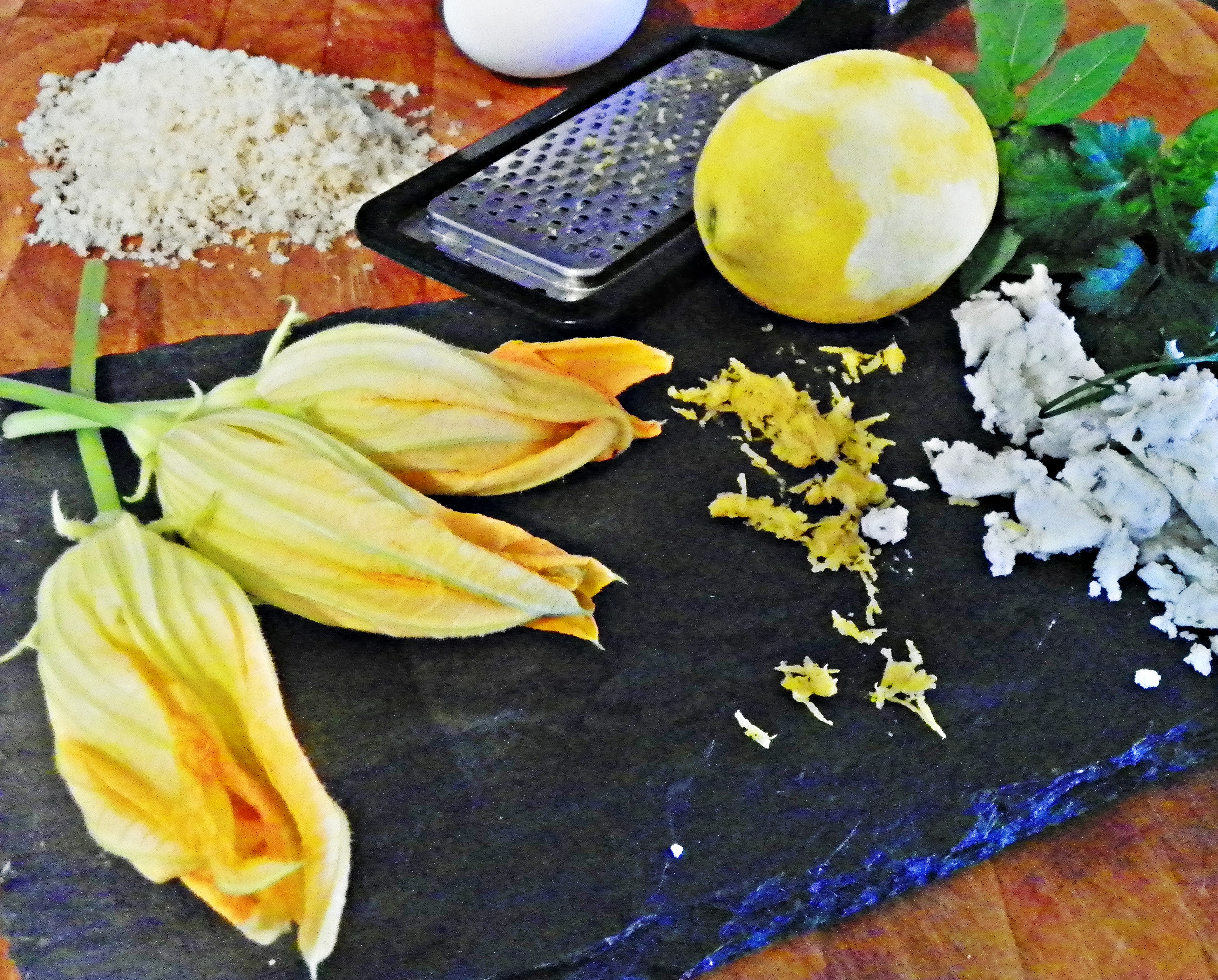 Soooo . . . my neighbor was out of town over the weekend and I checked in on her house. You know, I did the neighborly thing and took in the newspapers and checked out her garden for her. The tomatoes are coming along just fine. Cucumbers and peppers: fine. The squash was blooming. Yes, blooming. Gorgeous bright and fluffy flowers. They were right there. And no one was looking. So I took some. Three, to be exact. Only three. She wouldn’t miss them, right? Besides, I was already drooling, imagining the goat cheese hot and oozing out of the crispy yellow petals. So I skulked home with the stolen property.