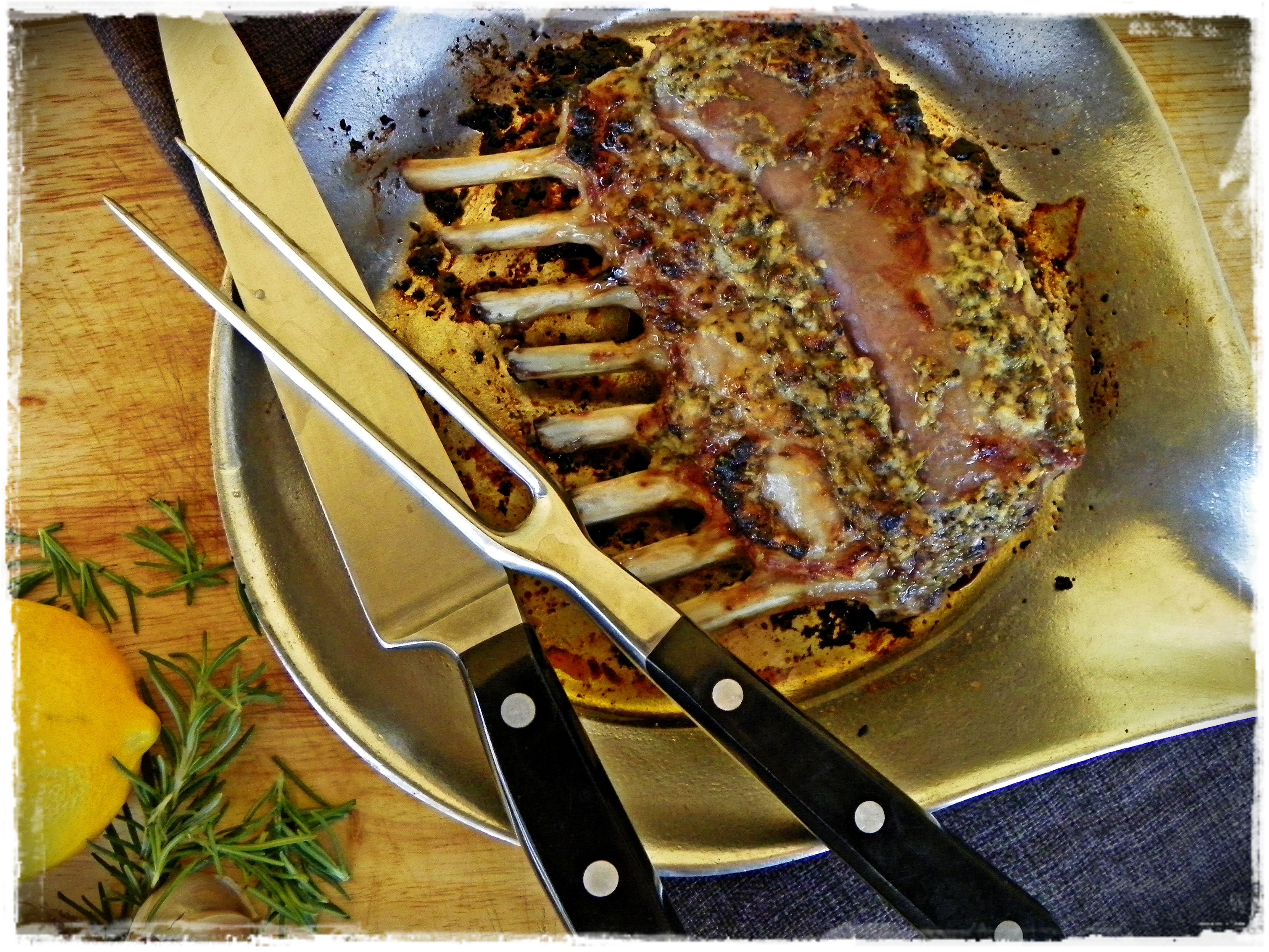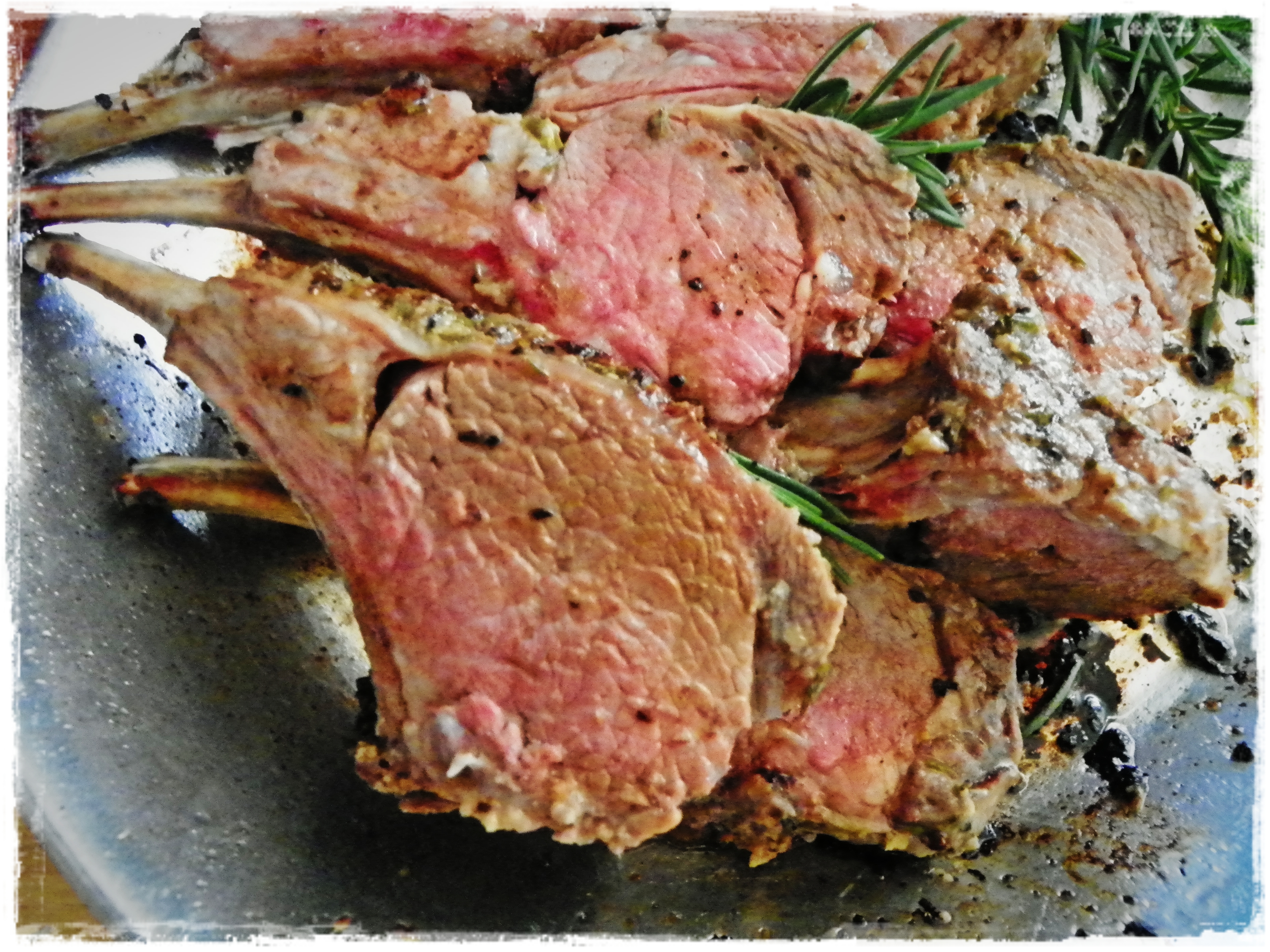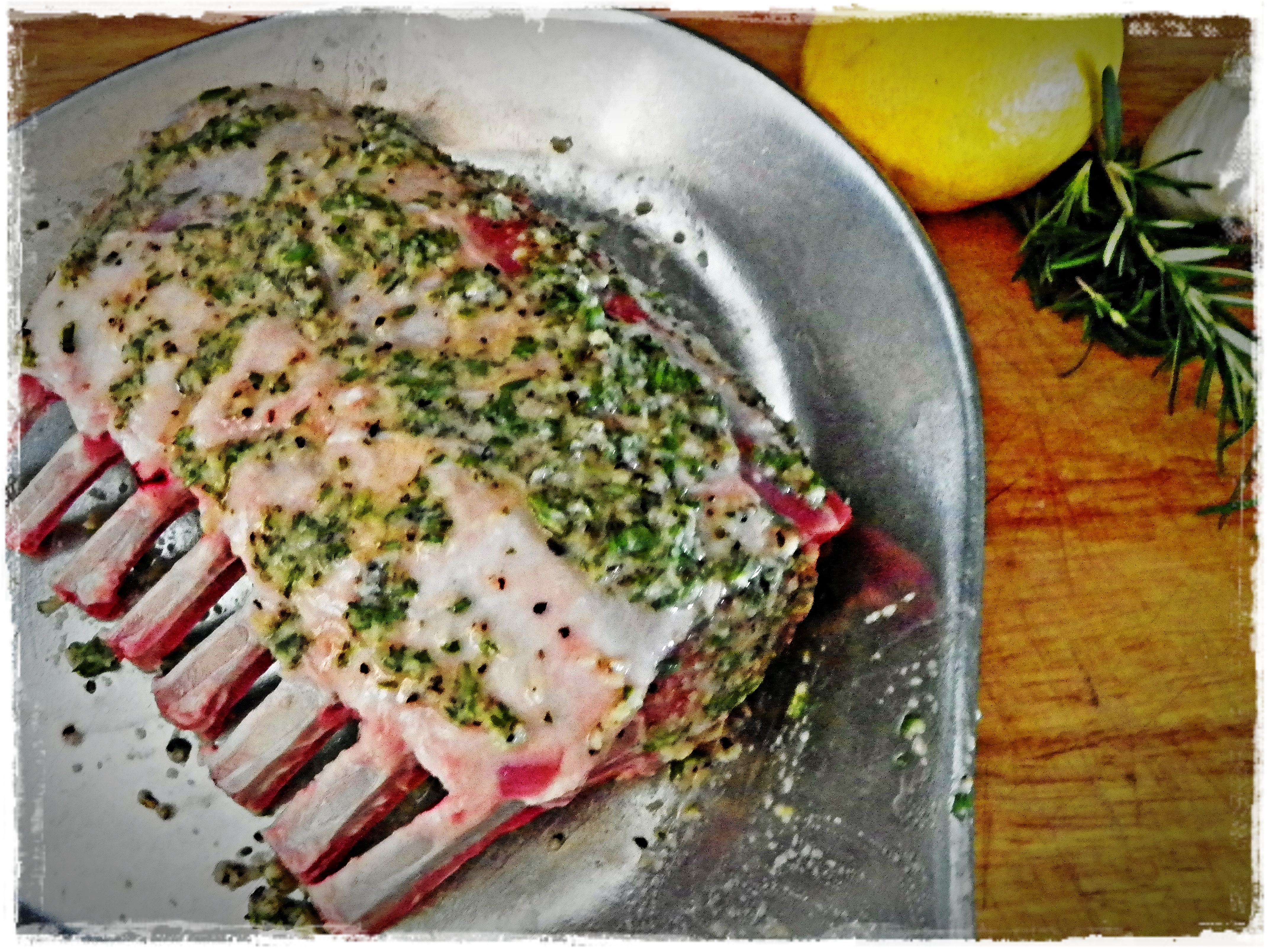For one rack of lamb, I use about 1 generous tablespoon chopped fresh rosemary; 2 cloves of garlic, minced or pressed (I like to use a garlic press to smash it up real well for the paste); 2 teaspoons kosher salt; 1 teaspoon coarse ground black pepper; 1/2 teaspoon fresh squeezed lemon juice; 1 teaspoon fresh grated lemon zest. Combine it all in a small bowl and then mix in just enough olive oil to make a loose paste. Then rub it all over the lamb–get your hands dirty!