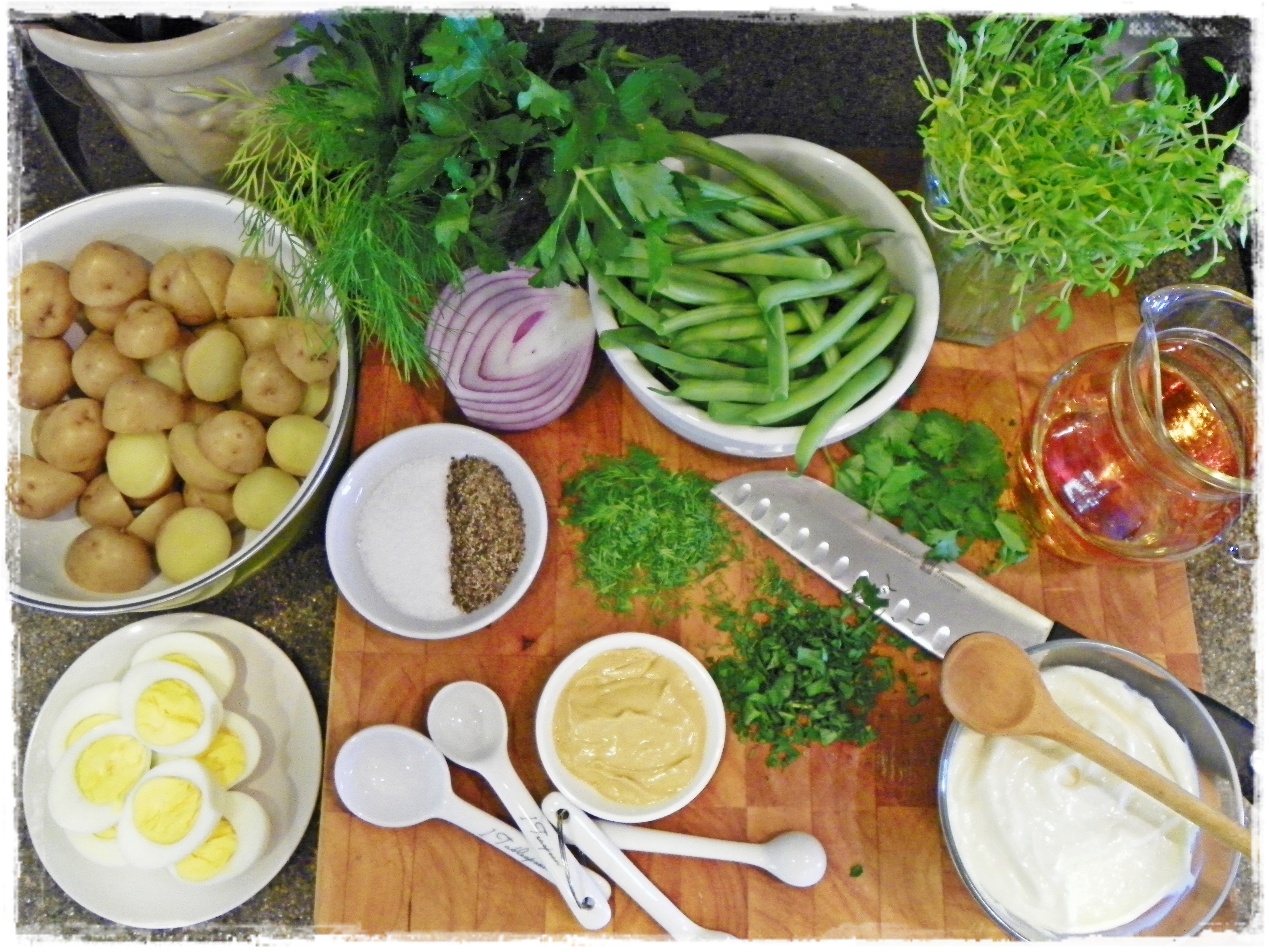 To assemble the salad, in a large bowl combine the cooked and cooled potatoes and green beans. Add the dressing and toss to combine. Add the remaining ingredients and toss gently.