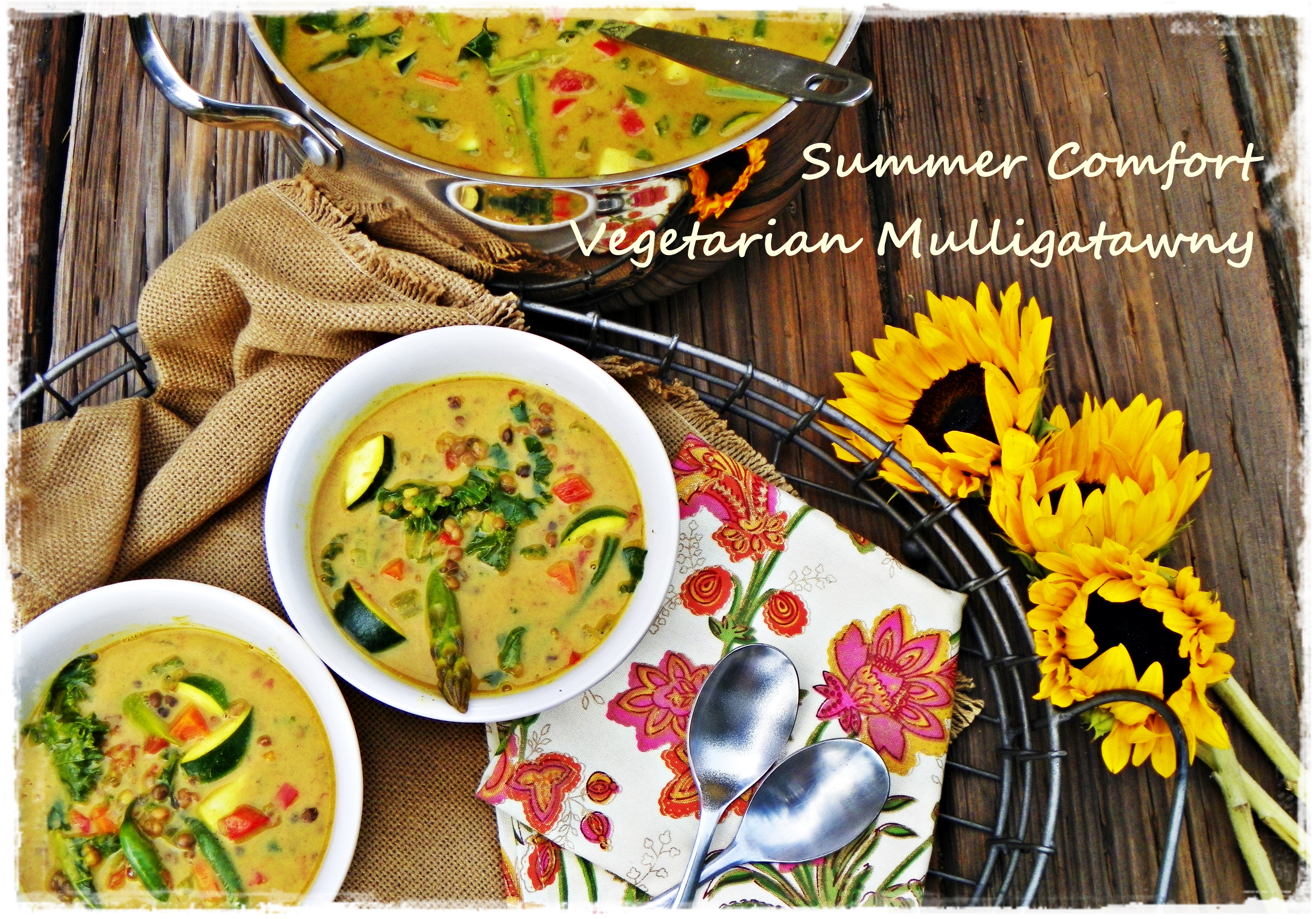 Mulligatawny is a soup of India, with lots of complex flavors. Sometimes it’s spicy; sometimes it’s not. The traditional version includes chicken, rice and curry powder. I’ve taken out the rice and used lentils and I’ve loaded it with summer vegetables. I use coconut milk and vegetable broth to add depth. It’s delicious.
