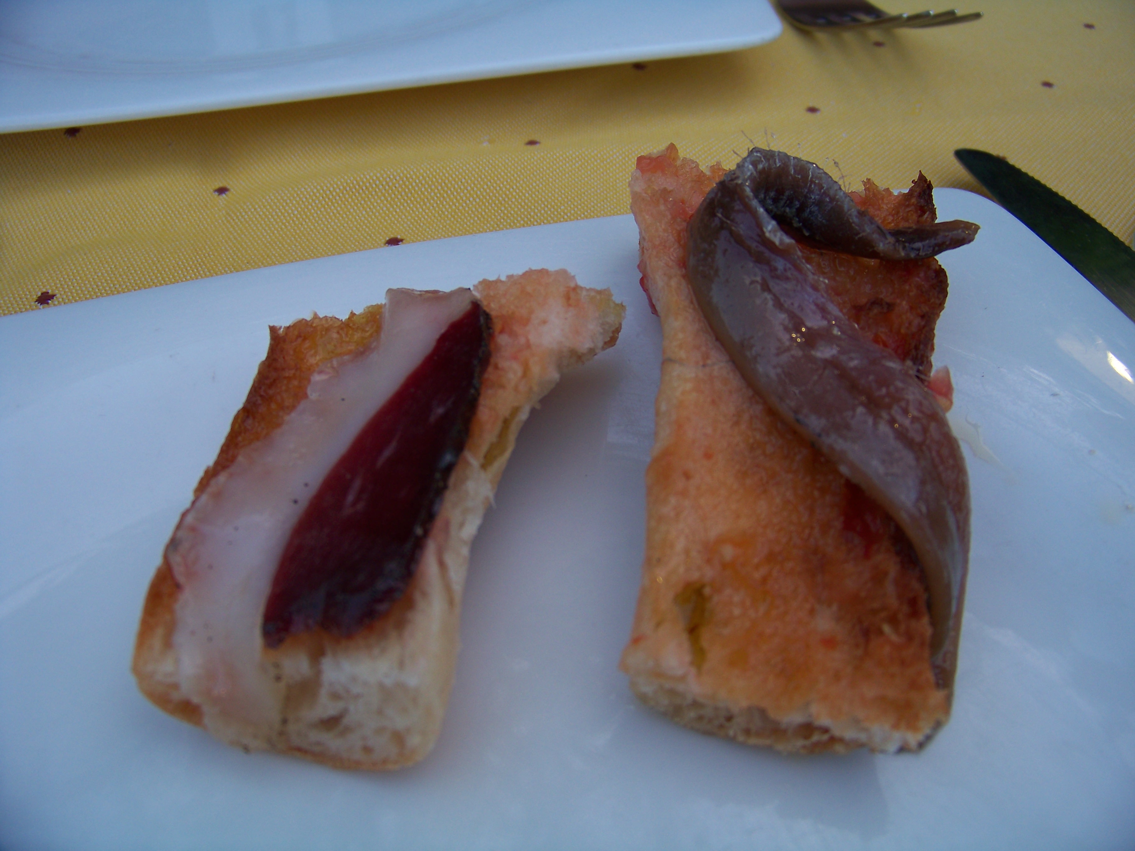 Slice the tomatoes in half and then rub the cut side over the bread or squeeze the pulp over the bread slices while discarding the skins. Sprinkle some sea salt and season with freshly ground black pepper. Drizzle with a little extra version olive oil (Spanish, of course!). This should be served immediately. My husband and I enjoyed some delicious Pan con Tomate in Catalonia topped with jamon Iberico, duck prosciutto and anchovies.