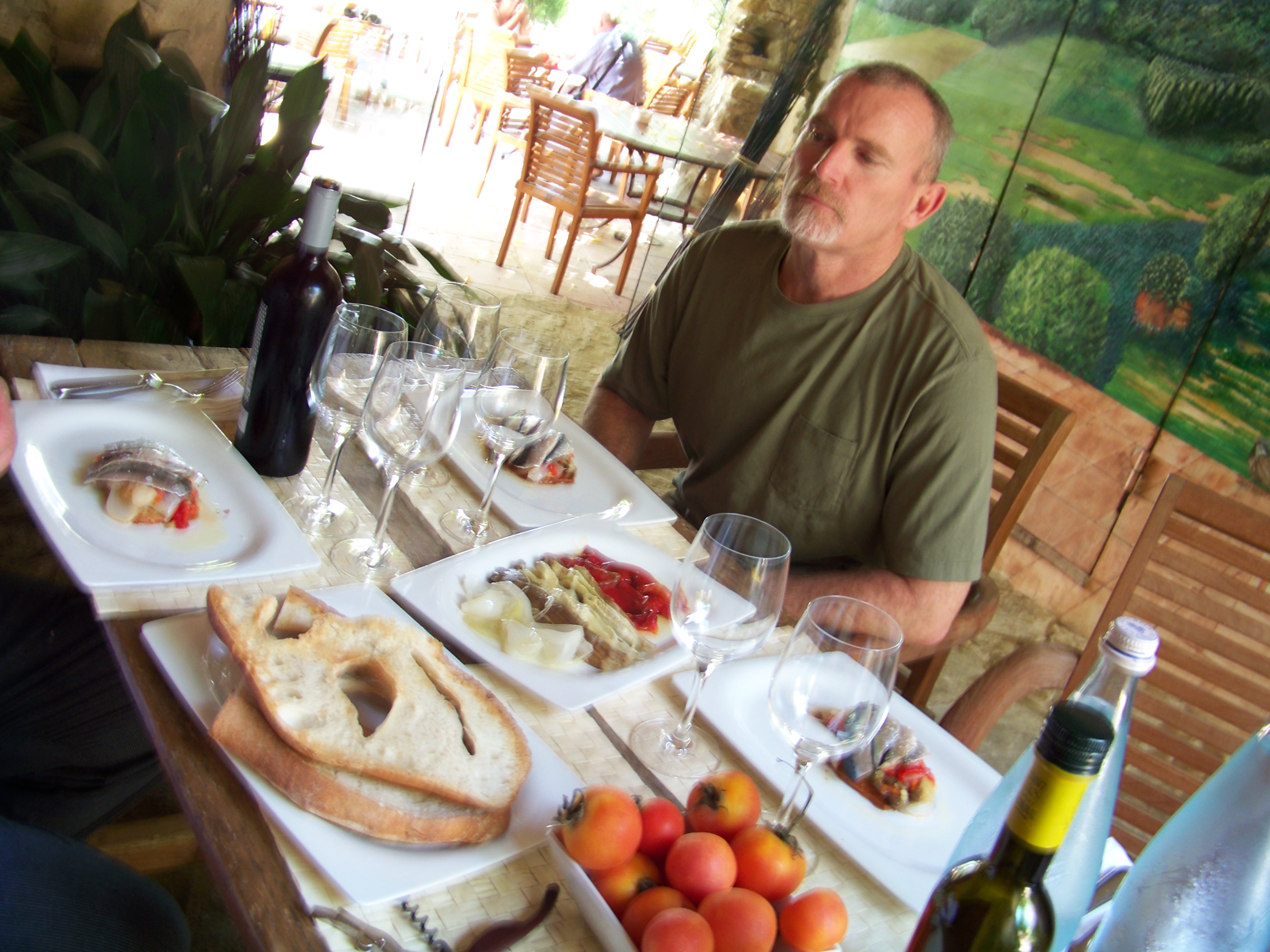 Lunch with Chef Vincenc, below. The bread is lightly toasted and ready for smothering with the beautiful Spanish tomatoes and garlic.