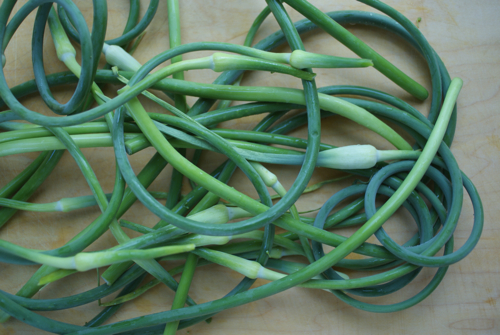 The green shoots will get bigger. Be patient. Despite their size, the garlic still has a little way to go at this point. In May, each garlic plant will sprout a long shoot in between its green leaves. When the shoot gets a seed head at the top, you can snap it off. Now you’ve got a garlic scape. You can stir-fry the garlic scape with some veggies-yum!