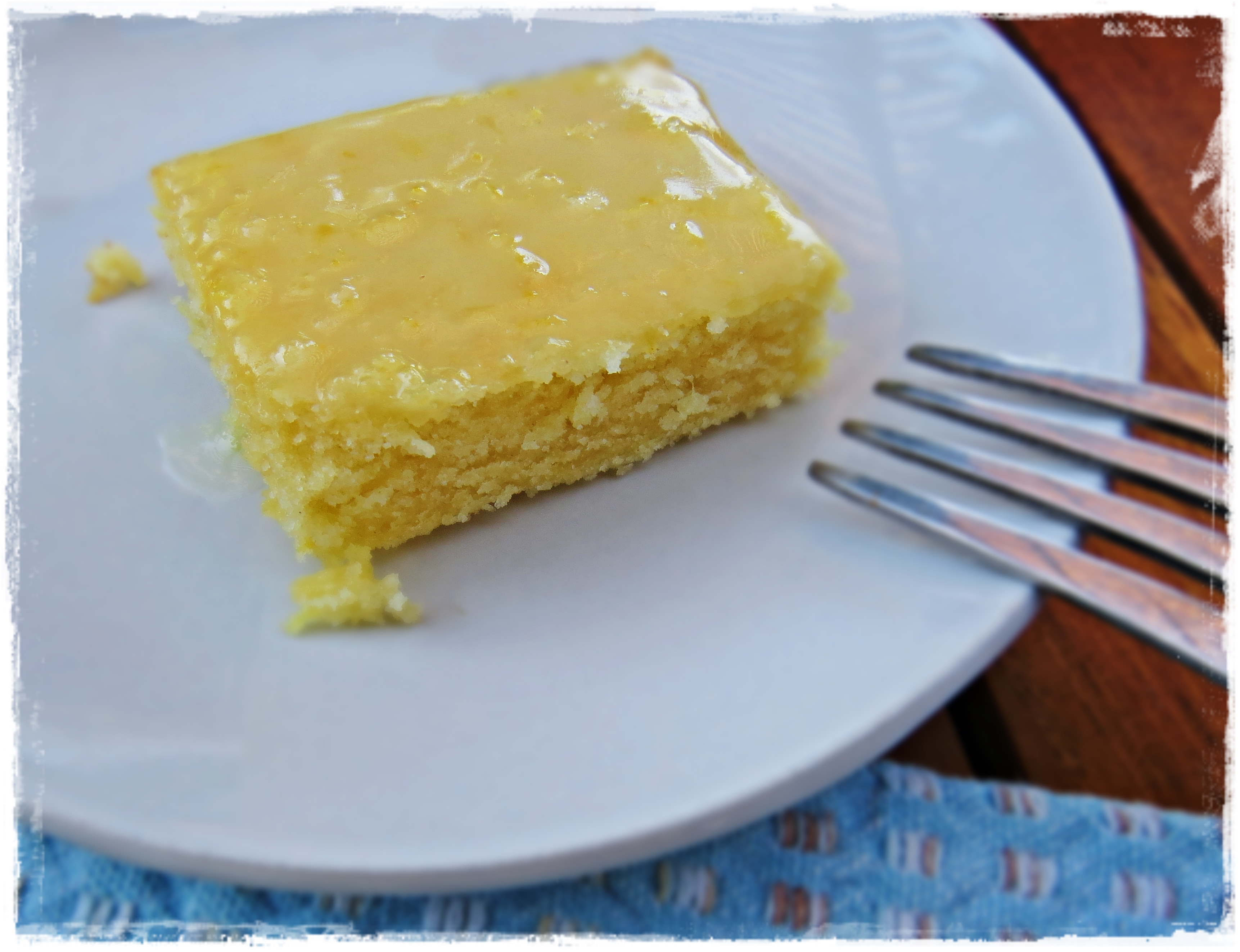 Jennifer never did give me the recipe. (I’m still waiting, Jennifer!) But recently, I saw a picture of lemon “brownies.” There is no chocolate in them, so I suppose they are not technically “brownies,” but they’re not exactly traditional “curdy” lemon bars, either. No crust. They’re more cakey–like brownies.